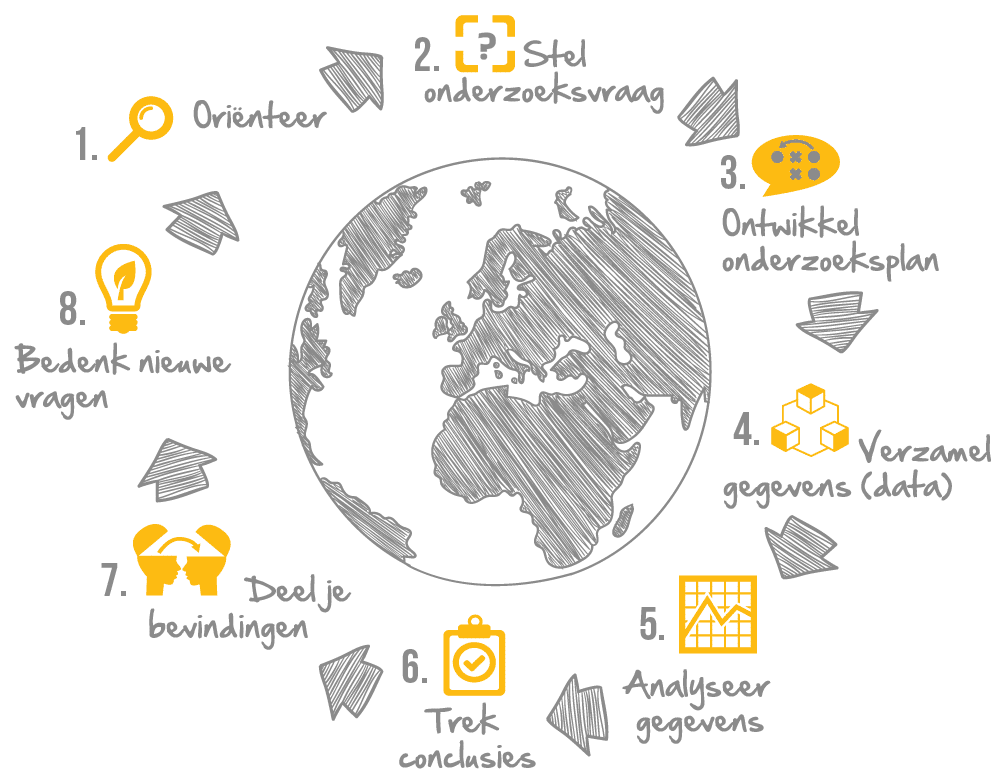 - Ben je op zoek naar een GLOBE onderzoeksproject? Volg dan de stappen van de onderzoekscyclus hieronder.