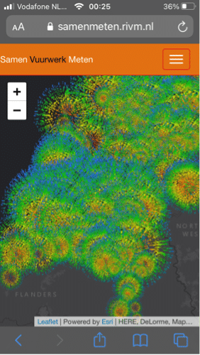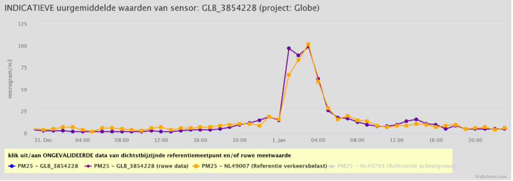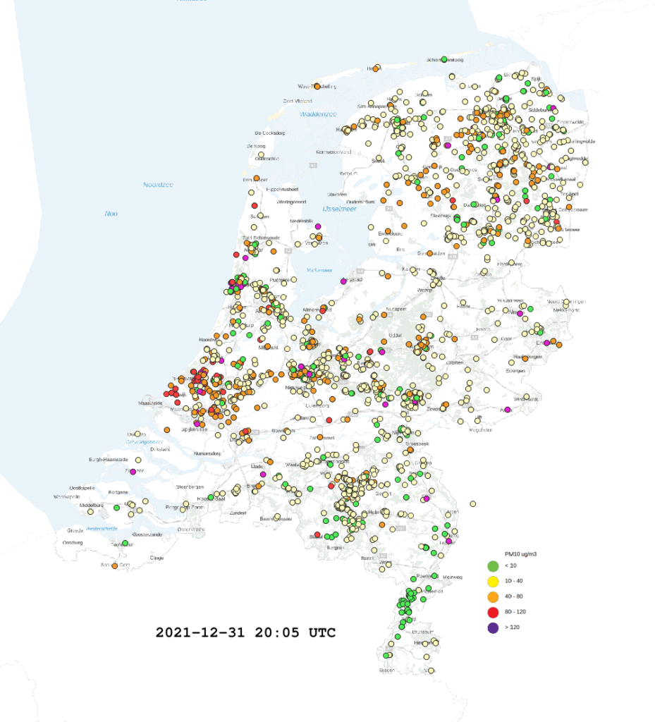 Met oud en nieuw heeft het RIVM voor het Samen Meten dataportaal speciale links gemaakt voor fijnstof en geluid. Ze toonden metingen met korte tijdsresolutie zodat je het vuurwerkeffect binnen een paar minuten meteen kon zien. Normaal gesproken zie je voor fijnstof op het dataportaal alleen uurwaarden.