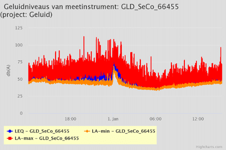 Op dezelfde plek werden ook geluidniveaus gemeten met een (standaard) hogere tijdresolutie dan voor de fijnstof. De geluidniveaus pieken ook vlak na 0:00, sommige knallen komen boven de 100 decibel uit! Maar vergeleken met de fijnstofpiek nemen de geluidmetingen vrij snel af. Fijnstof kan zich over honderden kilometers verplaatsen, bij geluid is dat in de orde van een paar honderd meter.