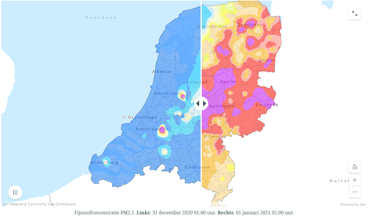 Rondom die interactieve kaarten kunnen weer informatieve pagina’s gemaakt worden, als een soort online presentatie. De fijnstofmodule (onderaan de pagina) is hier een mooi voorbeeld van.