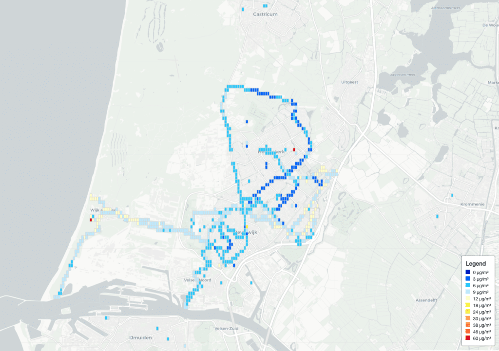 De dag begon met een introductie door Jeroen Olthof over de luchtkwaliteit in Noord-Holland, gevolgd door gesprekken en begeleiding van de teams bij hun onderzoek. Na hun onderzoeksplan te hebben uitgewerkt stapten de leerlingen op de fiets om fijnstof te gaan meten. Sommigen verkenden de kust, terwijl anderen de omgeving rondom Tata Steel onderzochten en weer anderen gingen fijnstofconcentraties in drukke wegen en winkelstraten meten. Op het kaartje hieronder zie je de resultaten van de snuffelfiets, te zien op www.knowyourair.net.