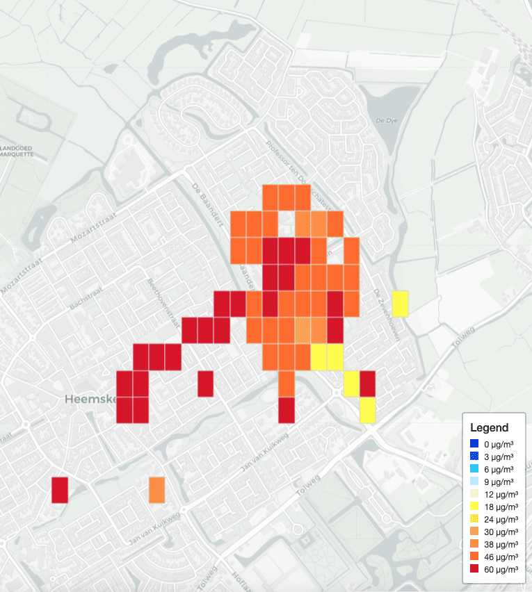 Op het kaartje hieronder zie je de resultaten van de snuffelfiets, te zien op www.knowyourair.net.
